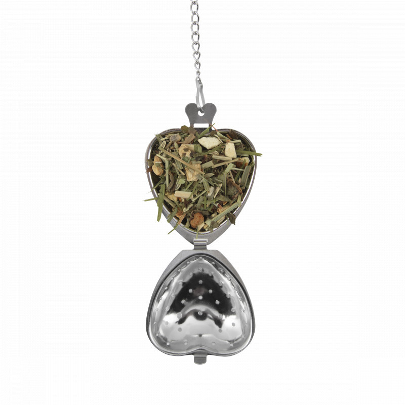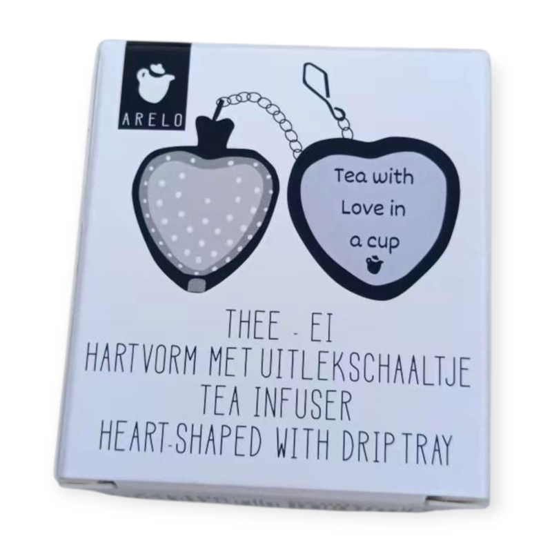Dit hartvormige theezeefje met uitlekschaaltje met de tekst "tea with love in a cup" is een echt kado om te geven en krijgen.