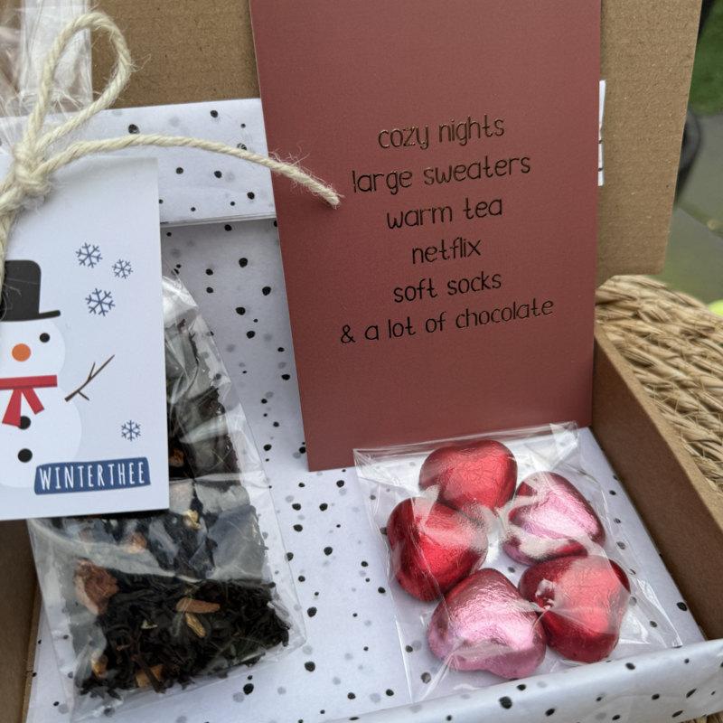 - kaart 'Cozy nights, large sweaters, warm tea, netflix, soft socks & a lot of chocolate'