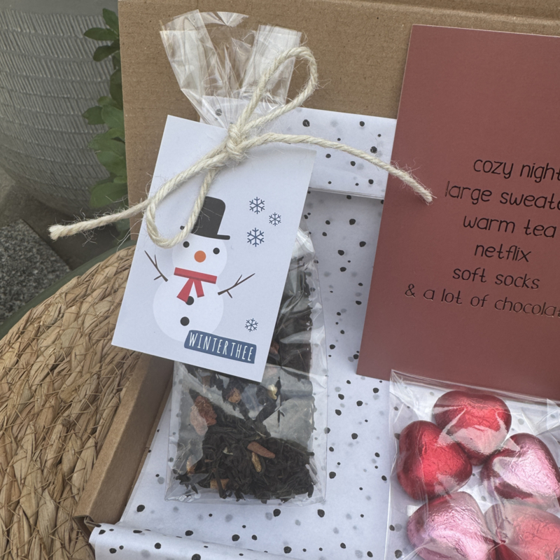De kadootjes zitten in een mooi kraft doosje met een grote sticker op de bovenkant, binnen in het doosje zit bijpassend inpak vloeipapier waar de kadootjes in verpakt zitten.