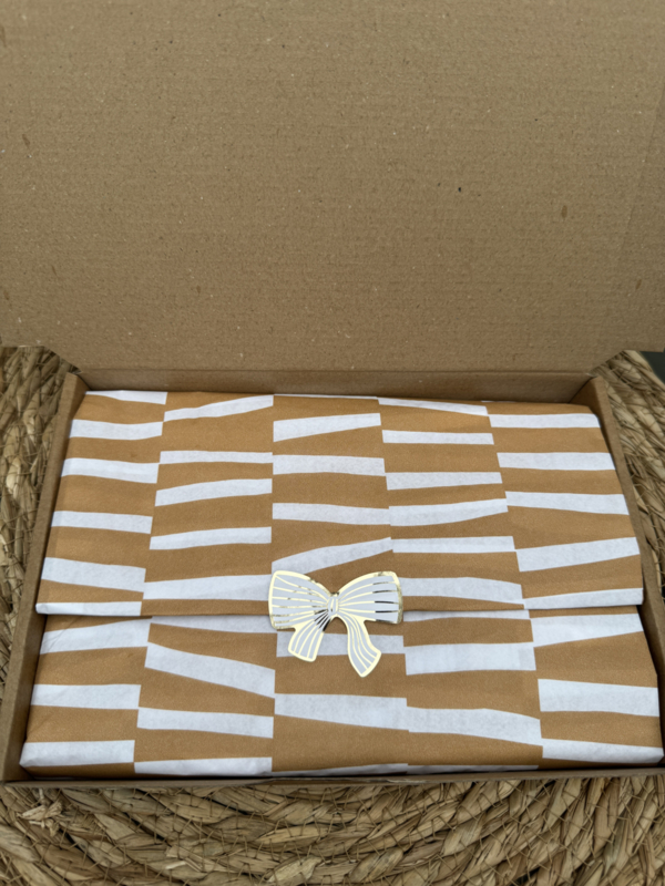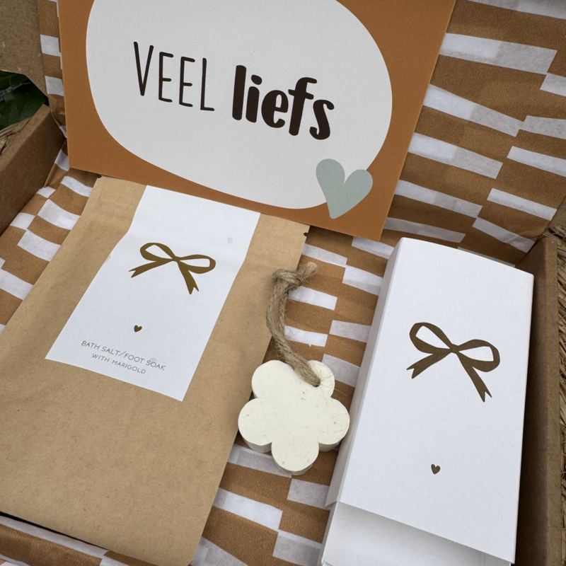 De kadootjes zitten in een mooi kraft doosje met een grote sticker op de bovenkant, binnen in het doosje zit bijpassend inpak vloeipapier waar de kadootjes in verpakt zitten.