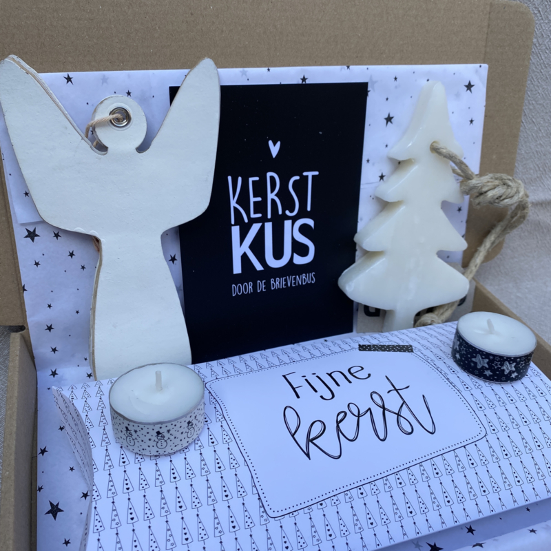Er zit een kaart in het doosje met de tekst 'KERST KUS door je brievenbus.' We kunnen namens jou/jullie een korte tekst naar keuze op het kaartje schrijven voor de ontvanger.