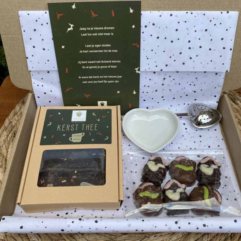 De kadootjes zitten in een mooi kraft doosje met een grote 'kerst' sticker op de bovenkant, binnen in het doosje zit bijpassend inpak vloeipapier waar de kadootjes in verpakt zitten.