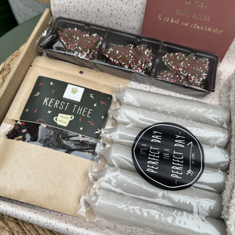 De kadootjes zitten in een mooi kraft doosje met een grote sticker op de bovenkant, binnen in het doosje zit bijpassend inpak vloeipapier waar de kadootjes in verpakt zitten.