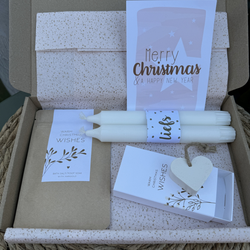 De kadootjes zitten in een mooi kraft doosje met een grote sticker op de bovenkant,…€ 11,70 - Doosje vol leuks 'Warm christmas wishes'