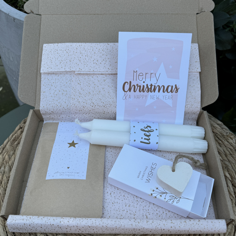 Doosje vol leuks 'kerst met een glimlach'Dit doosje vol leuks kan direct op de post (door ons of door jezelf) en past door de brievenbus.* Een feestje om te ontvangen en uit te pakken.