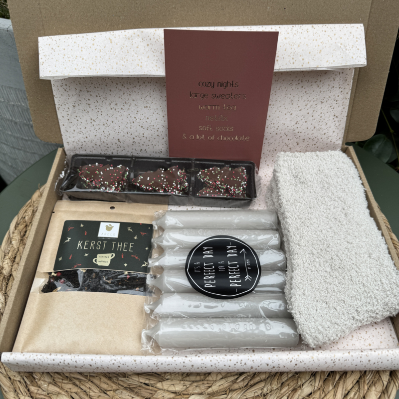 De kadootjes zitten in een mooi kraft doosje met een grote sticker op de bovenkant,…€ 17,25 - doosje vol leuks 'warm tea, soft socks & a lot of chocolate'